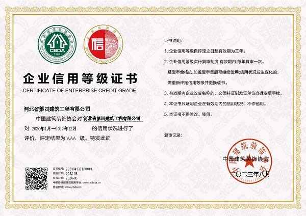 此次獲得中裝協(xié)AAA級企業(yè)信用等級證書(shū),是中裝協(xié)對公司堅持守法經(jīng)營(yíng)、誠信經(jīng)營(yíng)的充分肯定和高度認可,是對河北四建實(shí)力和品牌形象的最好詮釋。(質(zhì)量技術(shù)部)