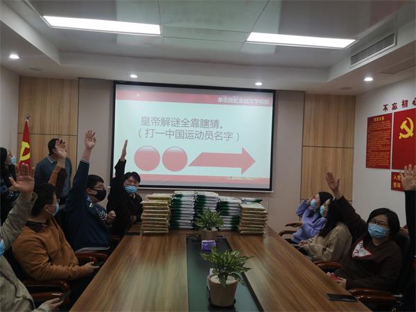 “正月十五貼對聯(lián),打一北京冬奧比賽場(chǎng)地?!贝笃聊粍傄环_(kāi),職工們紛紛參與競答,司南第一個(gè)站起來(lái)說(shuō):“是崇禮”,梁靖昆馬上跟上說(shuō):“你說(shuō)的不對,應該是延慶”,組織者說(shuō):“梁靖昆答對了,發(fā)獎品”?!罢f(shuō)上兩句趕緊溜,打一冬奧比賽項目?!敝灰?jiàn)李天昊站起來(lái)說(shuō):“是短道速滑,2月7日,任子威獲得了北京冬奧會(huì )短道速滑男子1000米冠軍,實(shí)現了中國隊在該項目上冬奧金牌零的突破??次疫@大長(cháng)腿,也非常適合這個(gè)項目?!贝蠹液迦淮笮??!按饘α?,發(fā)獎品?!彪S著(zhù)獎品的不斷發(fā)放,大家的熱情更高了,展開(kāi)了更加激烈的角逐,活動(dòng)現場(chǎng)精彩紛呈、高潮迭起,充滿(mǎn)了活力和趣味?;顒?dòng)結束后,組織人員還為每名職工發(fā)放了湯圓。