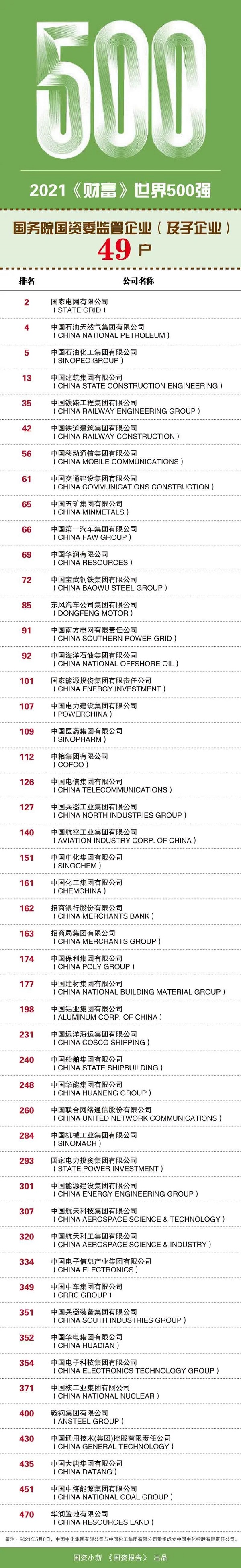 2021年度國務(wù)院國資委監管的49家入圍世界500強的中央企業(yè)(及子企業(yè))完整名單